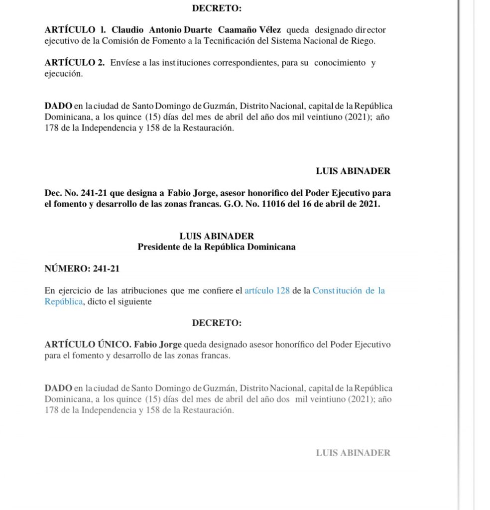 :: :: Dec. No. 241-21 que designa a Fabio Jorge, asesor honorifico del Poder Ejecutivo para el fomento y desarrollo de las zonas francas. G.O. No. 11016, del 16 de abril de 2021. :: ::