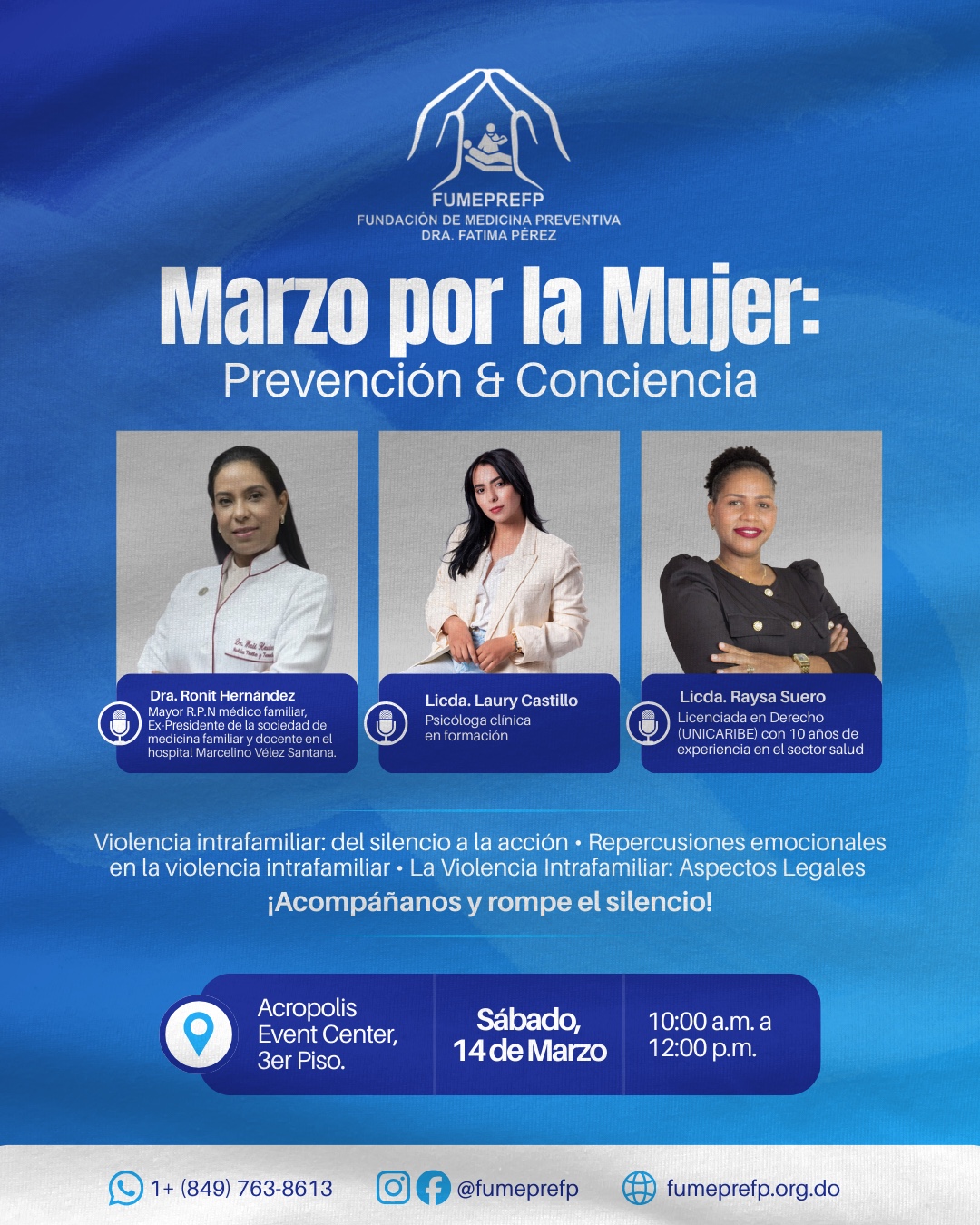 Santo Domingo, RD. – En el marco de la conmemoración del Día Internacional de la Mujer, este 8 de marzo, la Fundación de Medicina Preventiva Dra. Fatima Pérez (FUMEPREFPP), realizará el próximo sábado 14 de marzo el taller “Marzo por la Mujer: Prevención y Conciencia”, en el Salón de Eventos del 3er. piso de Acrópolis Event Center, de 10:00 de la mañana a 12:00 del mediodía.